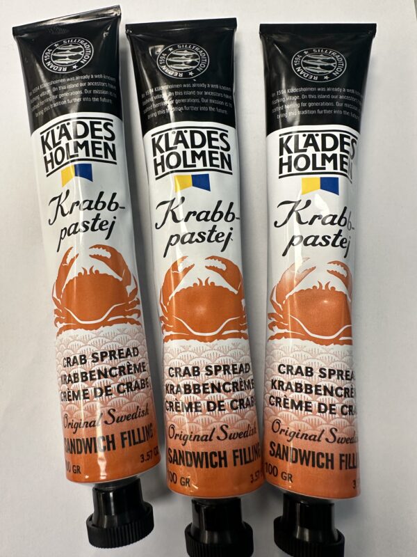 Vegetabilisk olja, KRABBKÖTT (Cancer pagurus 33%), TORSKROM (Gadus morhua 10%), vatten, socker, salt, tomatpuré, ÄRTPROTEIN, dill, ättika, citronsyra, naturliga aromer, konserveringsmedel E211.