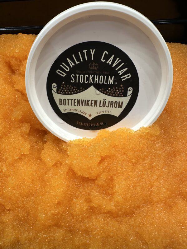Utforska en svensk delikatess med Bottenviken löjrom, omsorgsfullt framtagen från den svenska siklöjan (Coregonus Albula). Under fiskesäsongen mellan oktober och december fångas denna delikata löjrom längs sträckan från Sverige till Finland. Med en unik orange/gul färg och mindre korn än vår amerikanska premium löjrom, påminner vår Bottenviken löjrom om Kalix löjrom i både smak, storlek och färg. Priset gäller per burk, 500 gram.